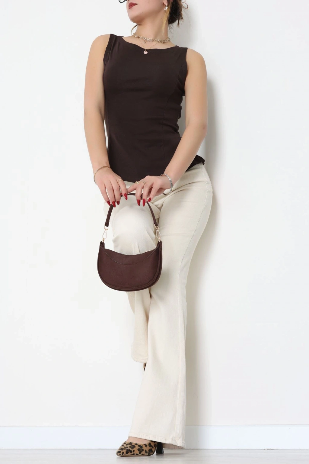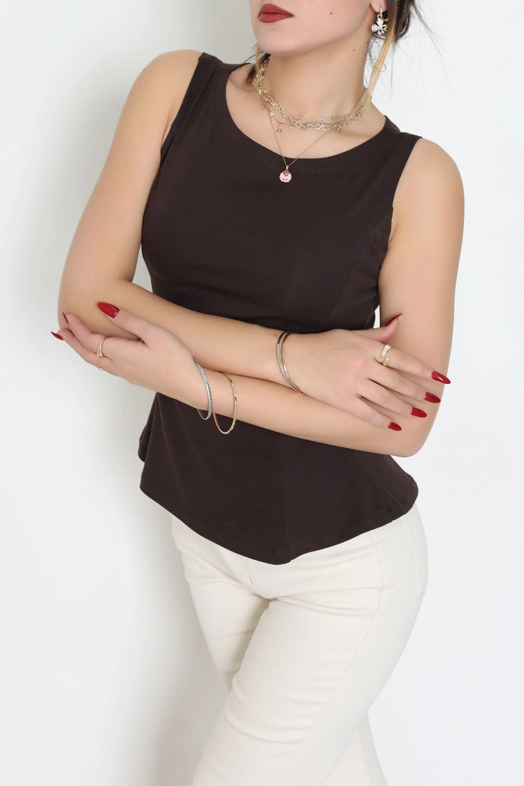 Volanlı Sıfır Kollu Ribana Bluz Kahve - 22070.200.