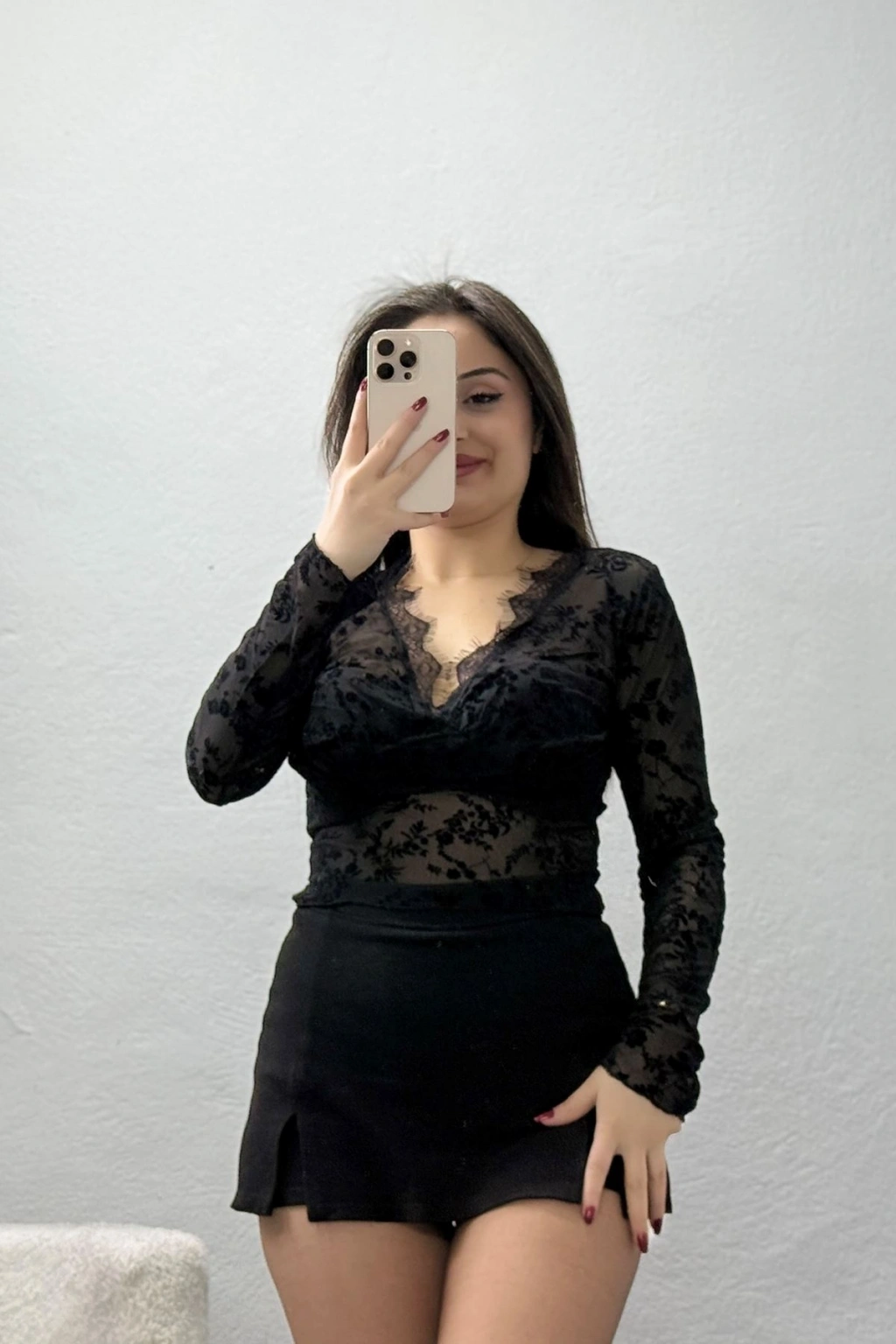 # Siyah Desenli Tül Bluz ## Zarif Detaylar ve Modern Kesim Özel davetlerde veya şık akşam yemeklerinde göz kamaştırmak isteyenler için bu **siyah desenli tül bluz** ideal bir seçenektir. V yaka kesimi ve transparan yapısıyla modern bir görünüm sunan bu tasarım, zarafeti ön plana çıkarıyor. Hassas dantel işlemeleriyle dikkat çeken bu parça, her ortamda fark yaratmanızı sağlar. İnce tül dokusu sayesinde hafif ve nefes alabilen yapısıyla gün boyu konfor sunan bu model, vücuda zarifçe oturur. Özellikle kollarındaki ve yakasındaki dantel işçiliği, bu bluzu sıradanlıktan uzaklaştırarak sofistike bir dokunuş katmaktadır. Uzun kollu bluz sevenler için ideal olan bu tasarım, şıklığı ve rahatlığı bir arada sunan fiyat performans ürünüdür. Hemen sepete ekleyin.